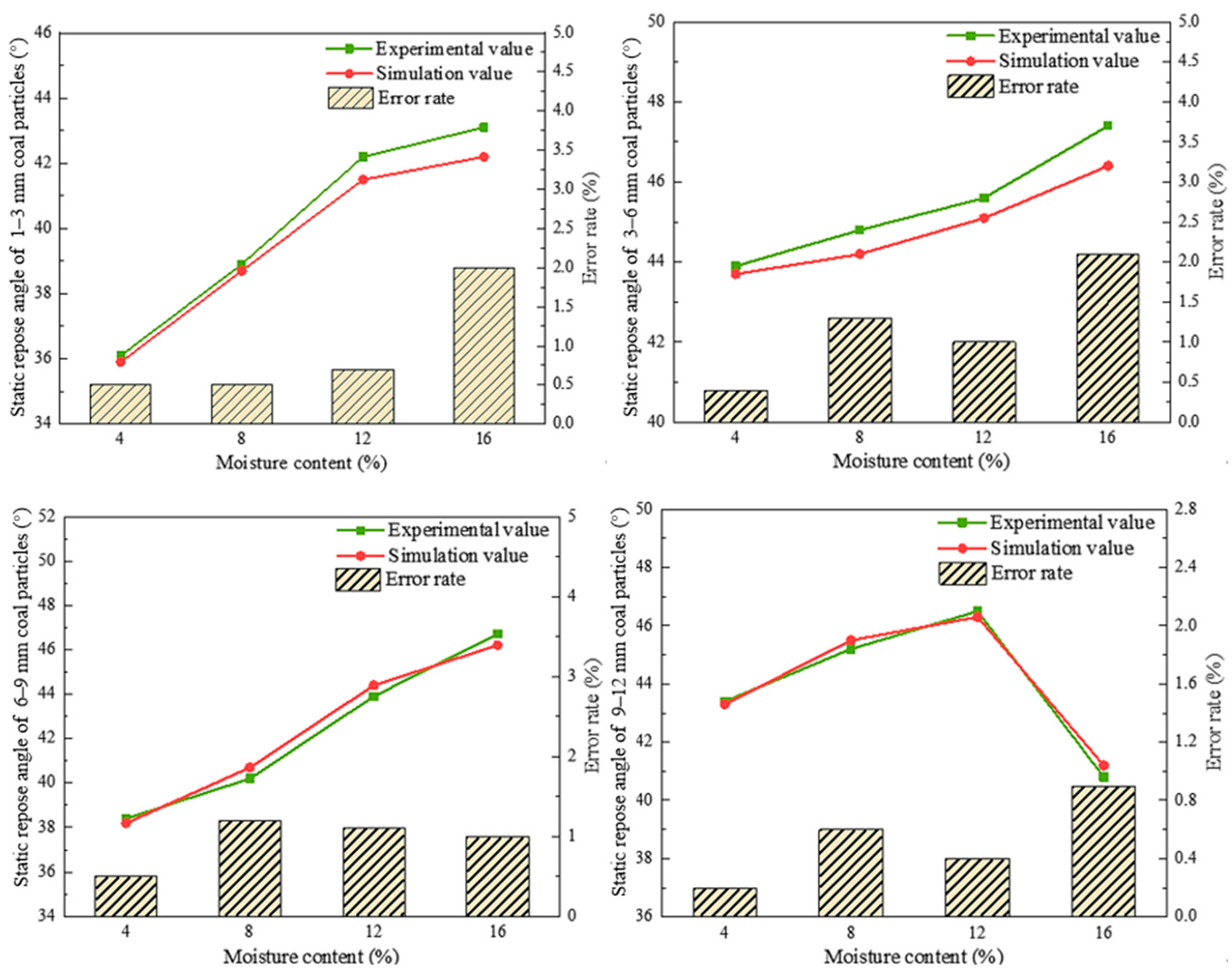 Figure 14. Comparison between experiment and simulation of static angles of repose for coal particles with different particle sizes.