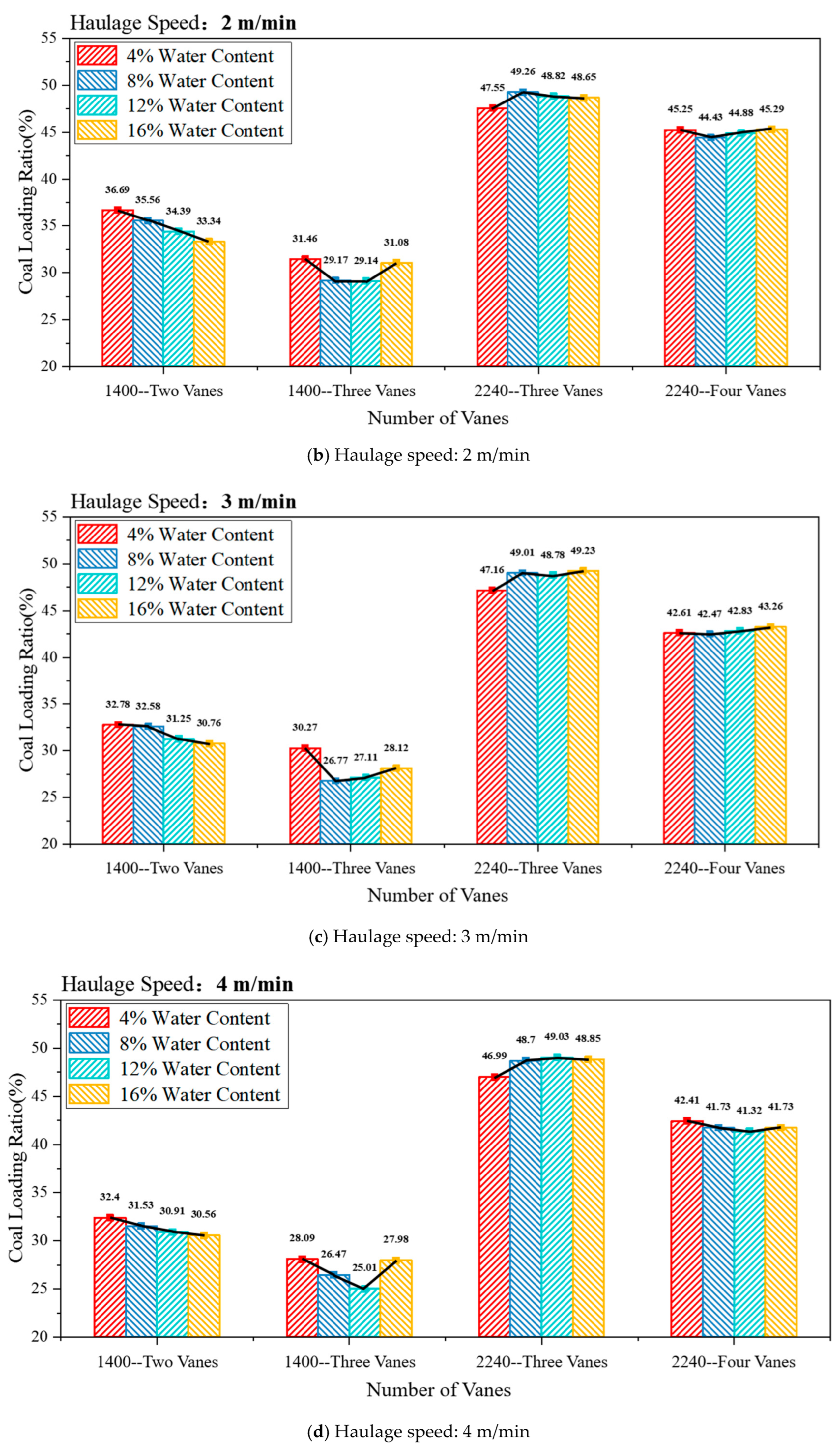 The loading rate of coal is significantly influenced by the number of vanes on shearer drums. However, in actual production, 1400 mm diameter drums feature two-vane and three-vane designs, while 2240 mm diameter ones have three-vane and four-vane designs, with the vane number corresponding to the optimal coal-loading rate remaining unclear. To reveal the correlation between vane number and coal-loading rate for such drums, parameters were calibrated through multiple physical tests in this study. Supported by field data, simulation analyses were conducted via the discrete element method to investigate the effect of the vane number on the drum coal-loading rate under different moisture contents and traction speeds. The results indicated that particle adhesion initially increases and then decreases with the moisture content, with the peak characteristics influenced by the particle size. Particle movement during drum coal mining is jointly governed by multiple factors. For 1400 mm drums, two or three vanes should be selected depending on moisture fluctuations and coal transportation requirements, whereas for 2240 mm drums, three or four vanes are recommended based on the balance between coal-cutting volume, conveying capacity, and traction speed.