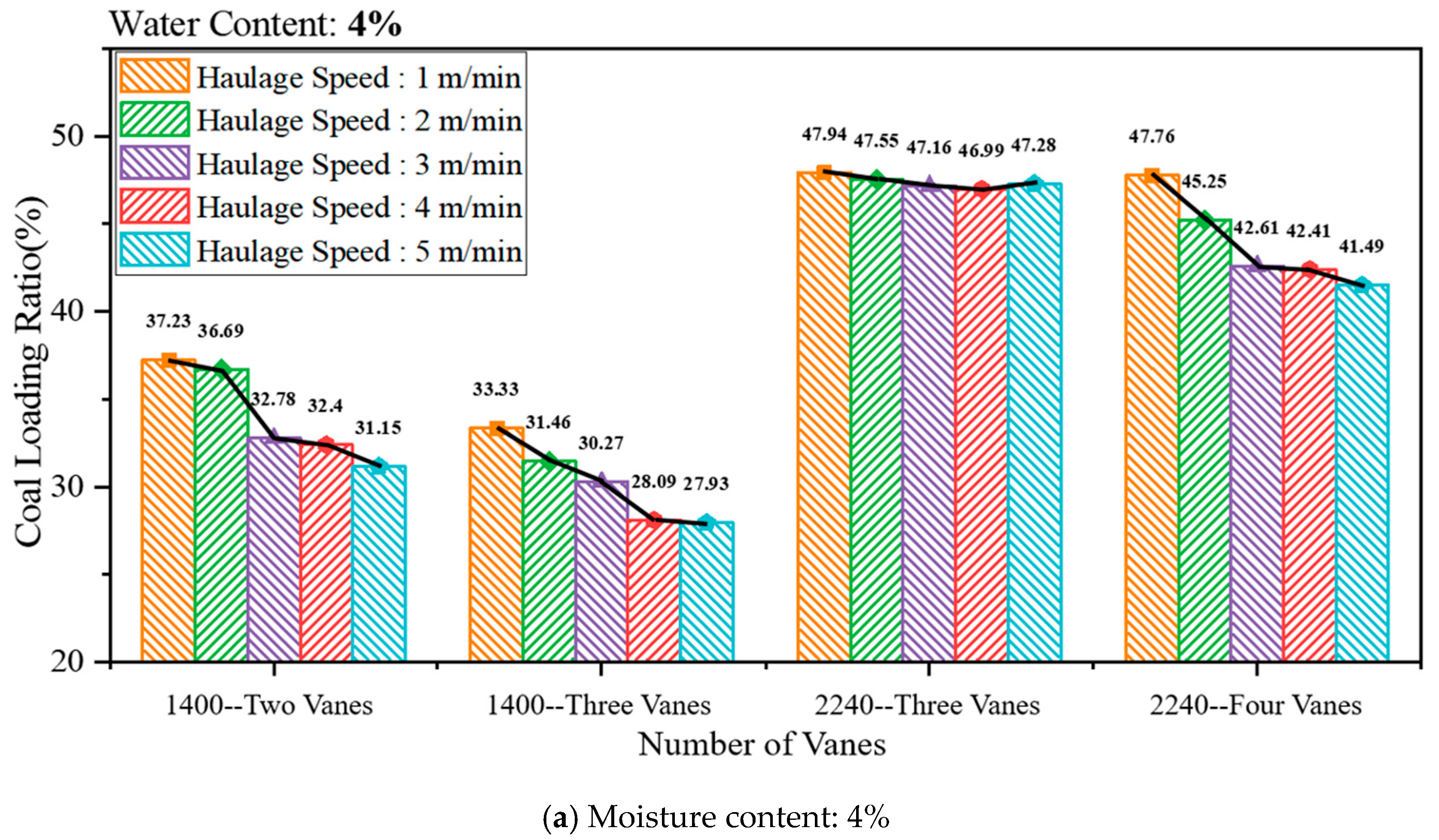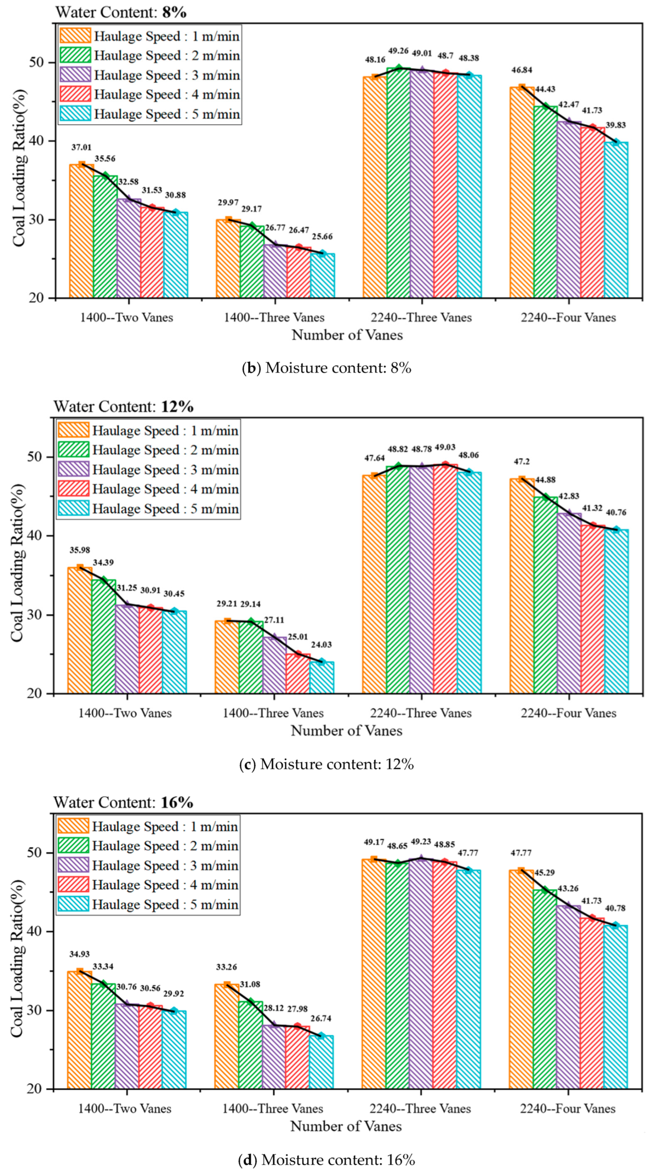 Figure 21. Relationship between number of vanes and coal-loading rate under different moisture contents.