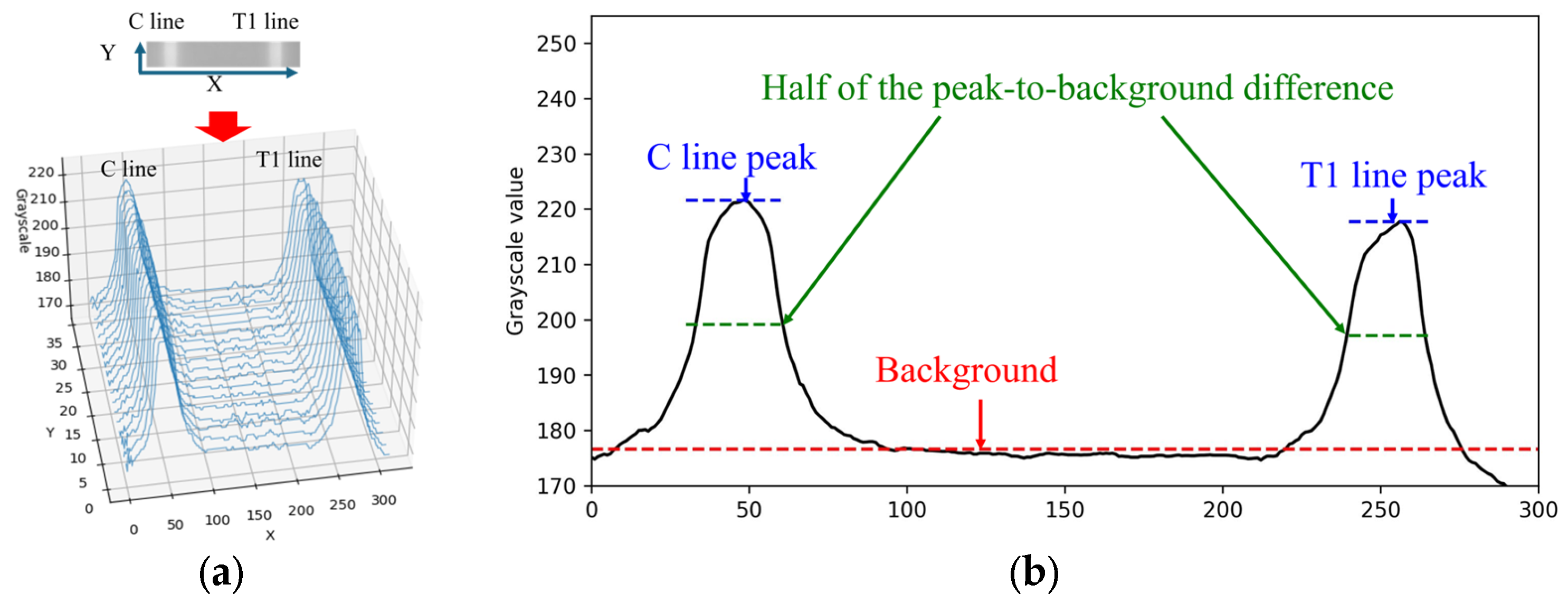bg was defined as the median grayscale intensity of the entire image, representing the baseline level of non-line regions. The peak grayscale intensity of the C line was denoted as I