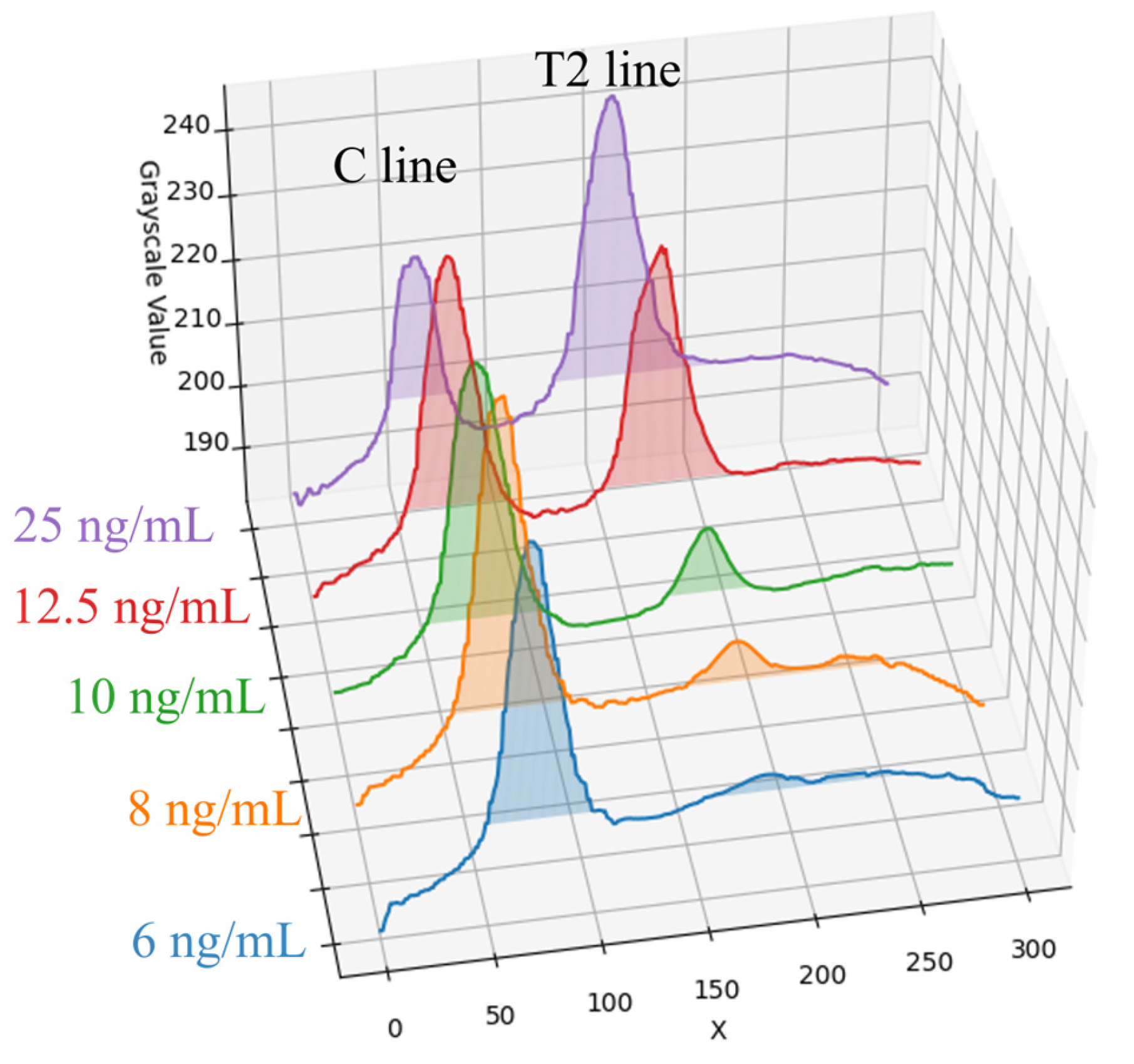 In addition, the background threshold was determined based on the median grayscale value within the ROI, rather than the overall mean. This choice was made because mean values are more susceptible to distortion from high-intensity signals, particularly from the T and C lines at higher sample concentrations. Such distortion can lead to an overestimation of the background level, subsequently causing underestimation of the actual analyte concentration and compromising quantification accuracy. Using the median as the reference background value thus enhances the robustness and reliability of the data.