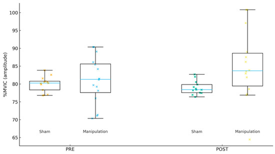 To ensure reproducibility, all measurements were performed by the same examiner under identical environmental conditions. Electrode positions were marked on the skin to allow for accurate replacement between PRE and POST sessions. Each participant performed three five-second MVICs separated by 30 s of rest, and the highest RMS amplitude was used for normalization. In the lower limb, published MVIC sEMG protocols using similar processing (band-pass 15–500 Hz, RMS windows, frequency-domain analysis) show good–excellent repeatability for amplitude and spectral measures (commonly ICC > 0.80, often approaching ≥0.90 for some muscles/metrics), though exact values depend on muscle and feature [12]. Normalized EMG values were expressed as a percentage of the session-specific MVIC (%MVIC) for both amplitude and median frequency to enable comparisons across participants and sessions.