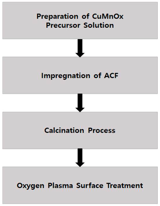 Four types of CuMnOx-loaded ACF were prepared depending on the amount of precursor, and were designated as ACF-0.1, ACF-0.3, ACF-0.45, and ACF-0.6, based on the weight of Cu(NO3)2·3H2O. Raw ACF without catalyst loading was used as a control. The detailed preparation process is summarized in Figure S1.