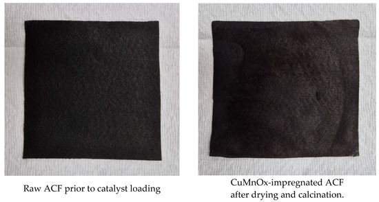 Finally, the dried samples were transferred to a tube furnace (TF1-600, Carbolite Gero Ltd., Hope Valley, UK) and calcined at 450 °C for 5 h under a nitrogen atmosphere. A heating rate of 10 °C/min was used to reach the calcination temperature. The physical appearance of the activated carbon fibers before and after CuMnOx impregnation is shown in Figure 2.