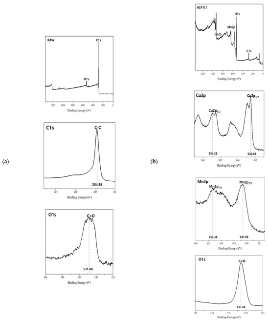 XPS survey and high-resolution spectra of C1s, O1s, Cu2p, and Mn2p: (a) raw ACF, (b) ACF-P-0.1.