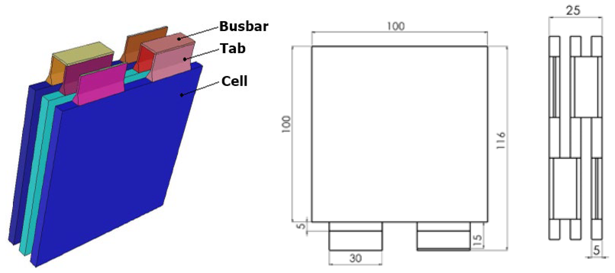 The investigated system is a 1P3S (single parallel, three series) battery with three pouch-type cells, each with a nominal capacity of 14.6 Ah. The geometrical dimensions of the experimental prototype and the arrangement of the seats are fully preserved (