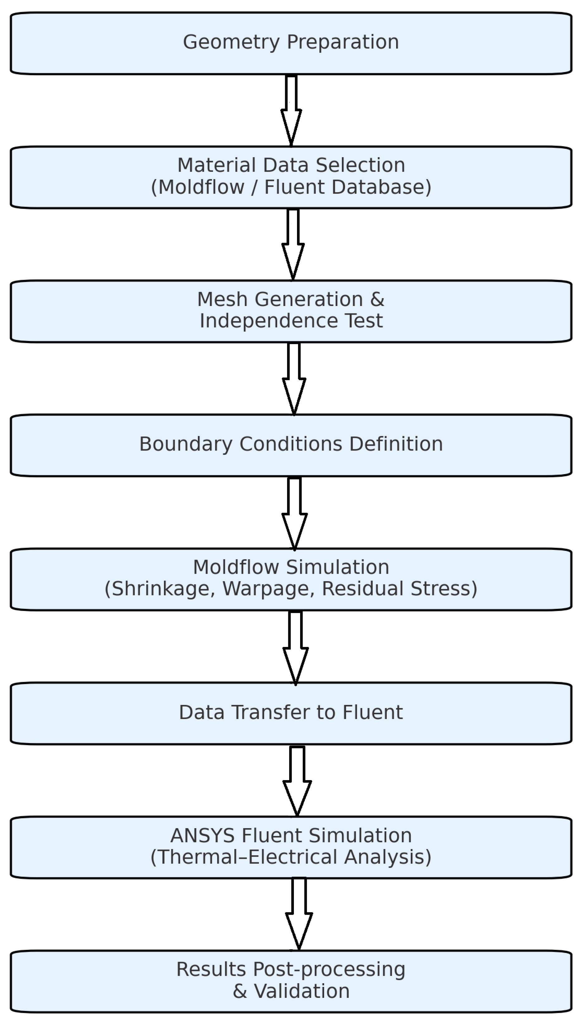 Console outputs confirmed that the battery network was consistently connected by verifying that one cell was placed in each series step at three stages. The above-mentioned boundary and modeling decisions ensured that changes in the thermal–physical properties of the polymer-based composites (PC+ABS, PEEK, and PP) were the only factors influencing the temperature field and heat diffusion in the battery pack, making the comparative results more reliable. The material properties used in this study were obtained from the experimentally calibrated and validated databases of Autodesk Moldflow and ANSYS Fluent 2024 software. Thus, although no experimental measurements were performed, the input parameters originated from reliable industrial datasets. In addition, grid independence analysis, convergence criteria, and boundary conditions (