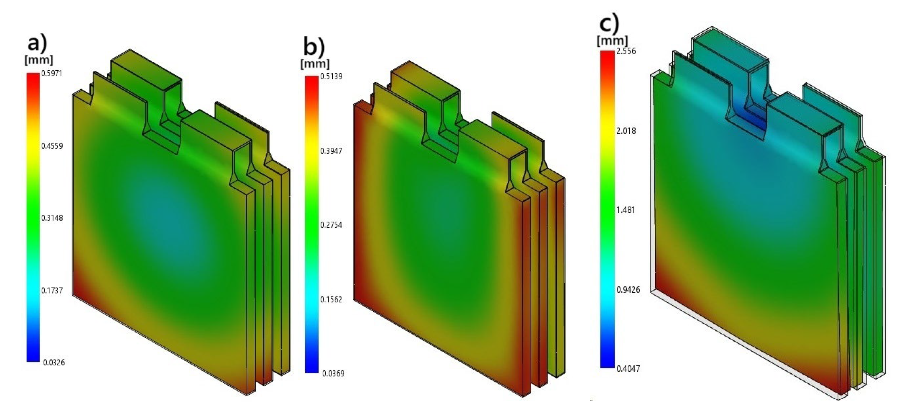 In the analyses conducted, the influence of the heat dispersion characteristics of the three different polymer composites, PC+ABS, PEEK, and PP, in a pouch battery module were thoroughly investigated. The analyses were carried out using ANSYS Fluent’s Battery Model plugin within the Multi-Scale Multi-Domain (MSMD) framework, and the electrochemical processes were solved by the NTGK/DCIR model simultaneously with the thermal field. The 1P3S configuration battery pack shown in