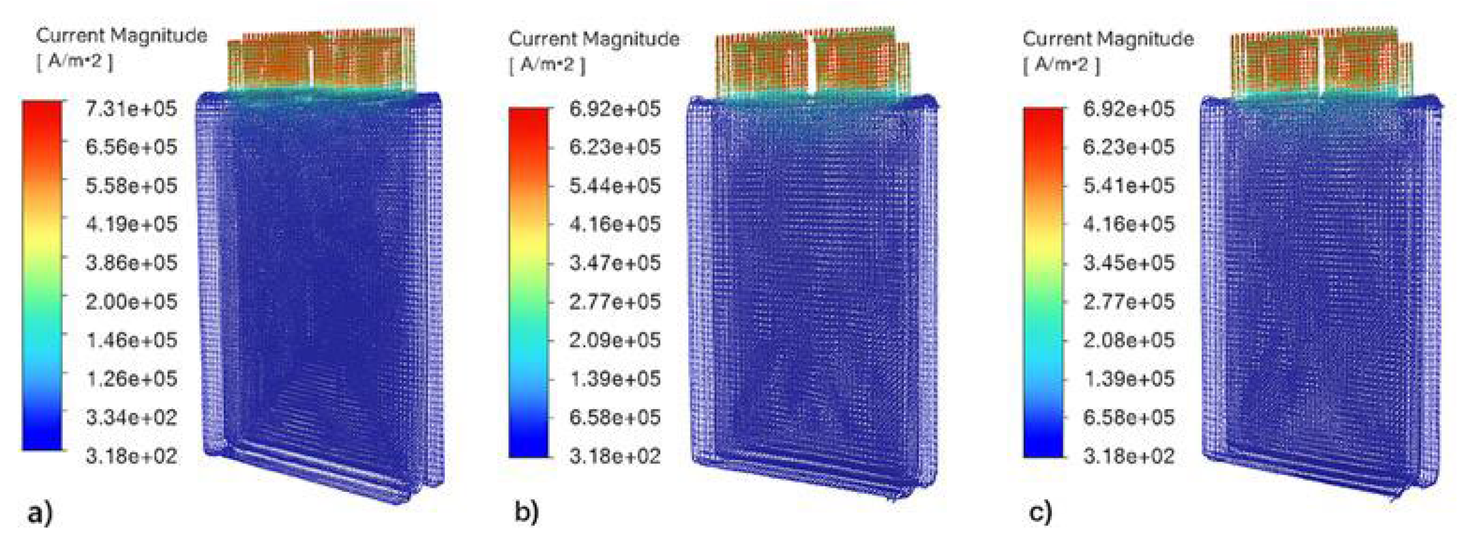 For similar PEEK surfaces, values were observed in the range of 559,054–558,541 A/m2, while for PP, the range was 558,987–558,506 A/m2. This difference indicates that the PC+ABS offers about 5.5% higher conductivity and can carry a denser current in the terminal regions. A similar trend was observed on busbar connection surfaces. For PC+ABS, the average current densities were found to be 535,253 A/m2 and 535,591 A/m2 in these areas, while corresponding values for PEEK and PP remained at levels of about 507,000 A/m2. In the side wall surface of the cell body, the current density was two orders of magnitude lower than in the terminal connection regions and was limited to the band of 27,800–29,300 A/m2 for all materials. This provides clear evidence that only a very small part of the electrical current is actually distributed broadly in the side surfaces of the cell, which are the only low-resistance parts of the conduction system in the auxiliary component. The highest local current density in PC+ABS was 731,040 A/m2; for PEEK and PP, these values were 692,428 A/m2 and 692,344 A/m2, respectively.