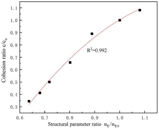 The functional relationship between the structural parameter ratio and cohesion ratio of soil samples with different moisture contents can be obtained from Figure 3 and Figure 4: