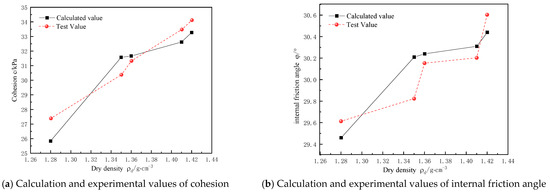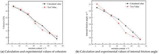 Figure 7 and Figure 8 respectively show the contrast between the test values and calculated values of the strength indicators of the undisturbed loess with different moisture contents and different dry densities. By comparing these results, it can be seen that the calculated strength indicators can reflect the authenticity of the test results.
