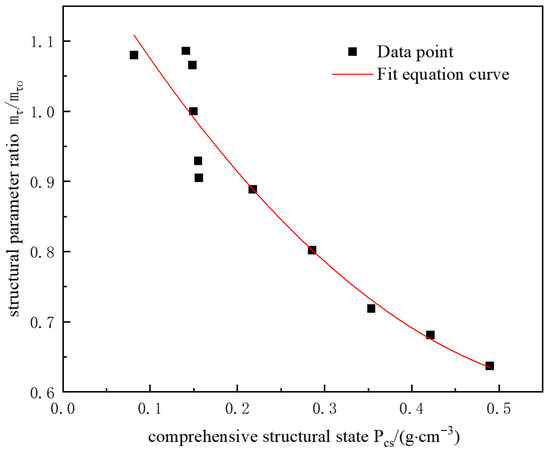 By substituting the physical property index values obtained from the triaxial shear tests of the loess soil samples, as presented in Table 7 and Table 8, into Formula (19), the values of the comprehensive structural state variable can be determined. A nonlinear fitting analysis of the functional relationship between the structural parameter ratio and the comprehensive structural state variable was performed using Origin 2022. The fitting yielded a correlation coefficient (R2) of 0.8984, indicating a good fit, as illustrated in Figure 9.