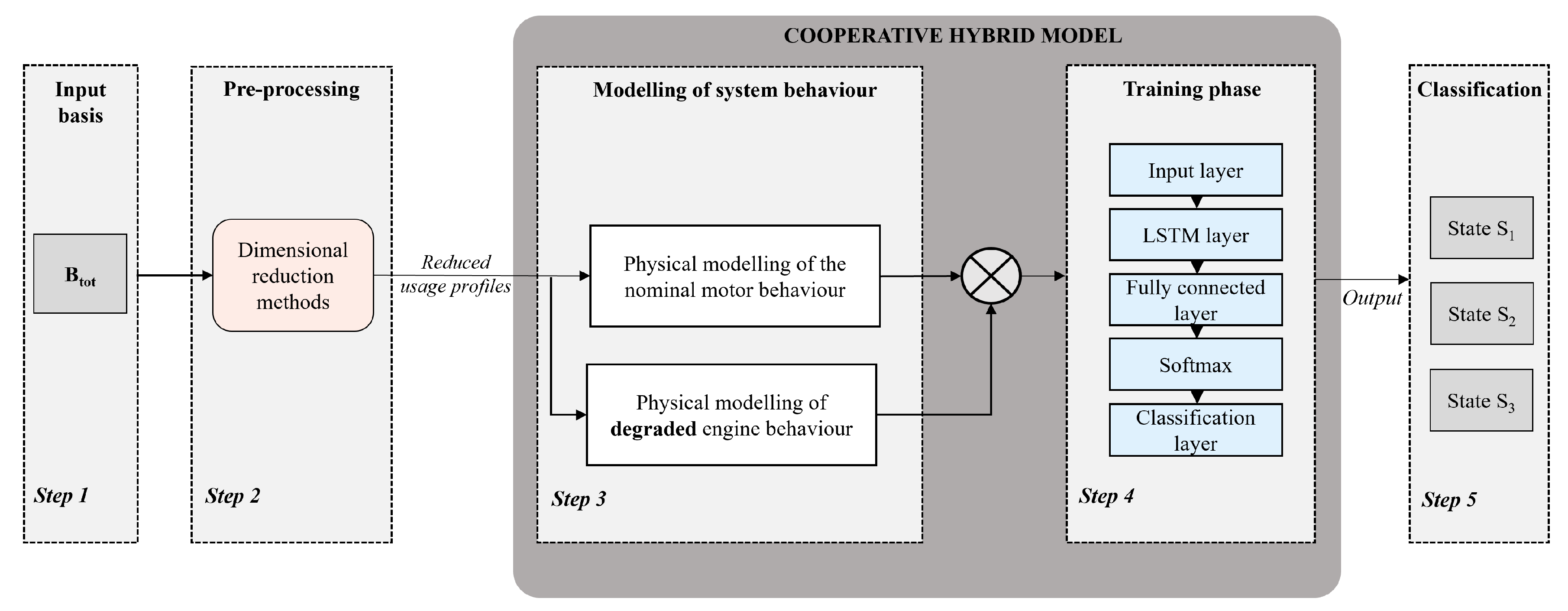 To provide context for the method developed in this work, we briefly present our previous contribution introduced in [47]. This earlier method was previously implemented to diagnose the wear state present on the bearings of an electric motor (see Figure 2). There are three potential wear states: progressive wear, characterized by continuous increase over a given period; stabilized wear, characterized by a lack of evolution; and absence of wear, indicating a healthy system state. As shown on Figure 2, a predictive classification model, referred to as a “black box”, is effectively trained for a sequence-to-sequence classification task. A physical model of the engine is first set up to represent the nominal behaviour of the engine. This same model is then degraded to reflect the actual behaviour of the engine, which may be subject to random faults (step 3). The input data for the physical model are speed profiles in the form of sine waves or square waves with different frequencies and amplitudes (step 1). The residuals between the nominal behaviour and the behaviour containing the faults are then used as input data for the predictive classification model (step 4). This model, known as the cooperative hybrid model, provides an output diagnosis of the state of the system (step 5). Once the model has been validated, dimensional reduction methods are applied to the speed profiles to reduce the cost of implementing the model and improve the model’s extrapolation capabilities. An optimum number of profiles is retained to ensure effective diagnosis. The predictive model used throughout this work can be expressed as follows: