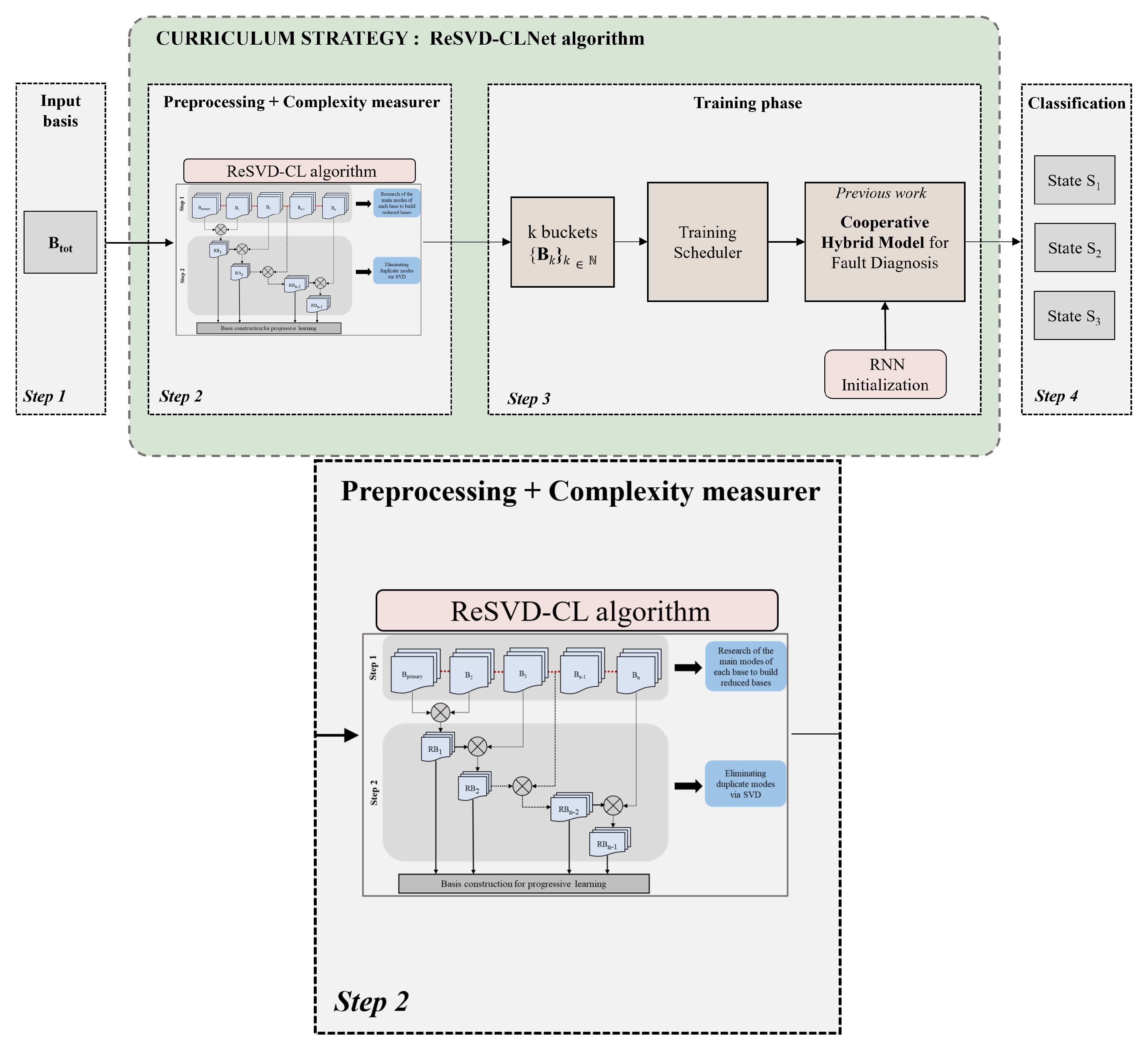 The second part is built on the concept of curriculum learning. The task is to develop a complexity measuring tool and a training schedule that can suggest a personalised curriculum strategy for temporal signals. Our strategy belongs to the automatic CL category, as it combines signal processing knowledge with a reliance on data-driven models. Regarding scheduling, it gradually retrieves unique modes. Due to this design, the obtained training bins will be unevenly divided, unlike most predefined curriculum methods in the literature. The implemented training scheduler belongs in this case to discrete schedulers. Kocmi [80] notably studied the effect of this sampling category by modifying the Baby-Step Curriculum Learning (BS-CL). The Cooperative Hybrid Model has the same structure as shown in Figure 2.