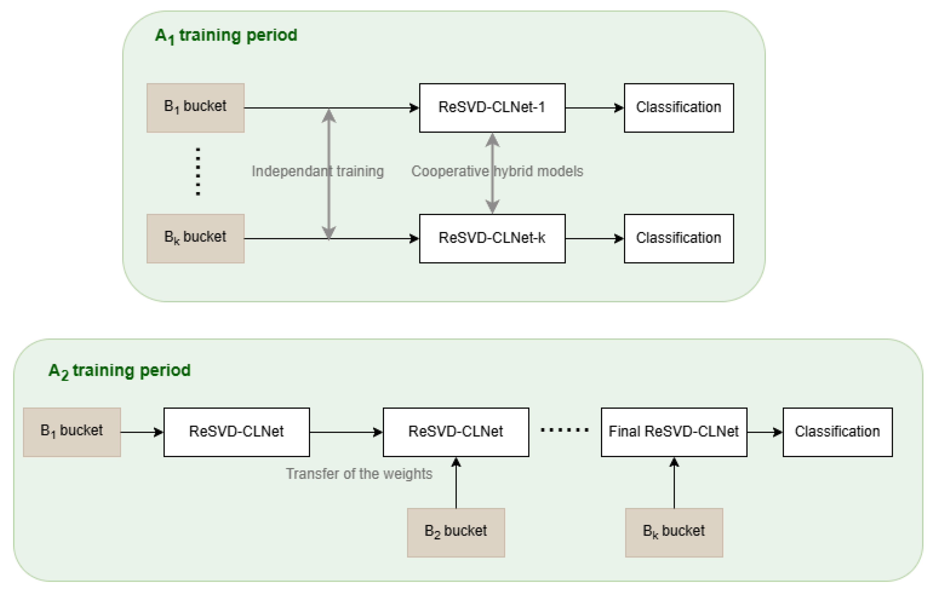 Figure 6. Illustration of the two main training phases: A 1 (independent learning on each B k ) and A 2 (progressive training via weight transfer across buckets).