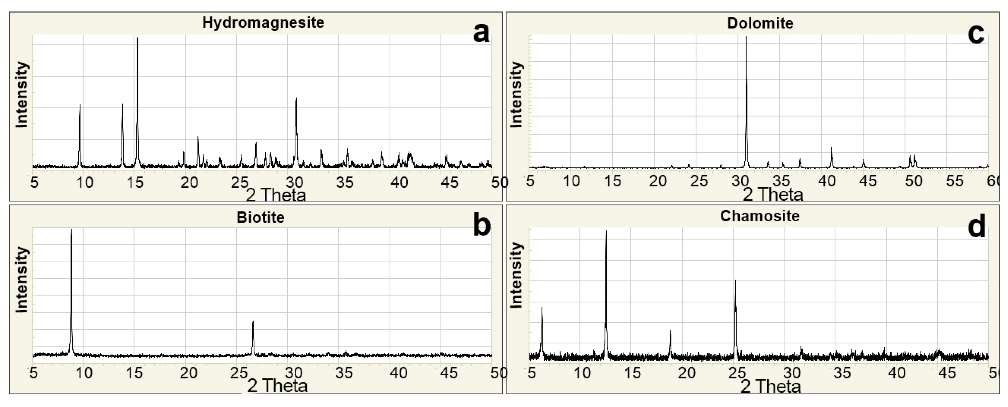 - Secchi, M.; Zanatta, M.; Borovin, E.; Bortolotti, M.; Kumar, A.; Giarola, M.; Sanson, A.; Orberger, B.; Daldosso, N.; Gialanella, S.; et al. Mineralogical Investigations Using XRD, XRF, and Raman Spectroscopy in a Combined Approach. J. Raman Spectrosc. 2018, 49, 1023–1030. [Google Scholar] [CrossRef]