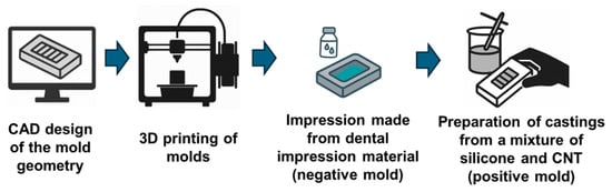 The next step was to make the castings. Two types of commercial silicone were used to make the casts: AD Special (Feguramed GmbH, Buchen, Germany) and Double 32 (Zhermack SpA, Badia Polesine RO, Italy). To increase electrical conductivity, carbon nanotubes were added in concentrations of 2% and 3% in silicone. The properties of the silicones used in the study are presented in Table 2. Figure 2 shows a diagram of the fingerprint casting process.
