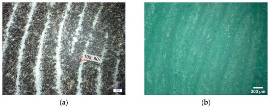Figure 3 shows a comparison of two methods of fingerprint imaging—a standard ink impression on a sheet of paper (Figure 3a) and a microscopic image of the impression surface made using Zhermarck Platinum impression material (Figure 3b). The ink impression served as a reference sample, as it is a commonly used method of fingerprint documentation in dactyloscopic practice. In both cases, the impression of the same finger was used, and the measurements of the width of the ridges and valleys were taken in the same places. The analysis showed that for the ink impression, the distance between the grooves was 105.90 μm, while for the Zhermarck Platinum impression, it was 174.82 μm. The lower value obtained for the standard fingerprint was due to the flattening of the ridges of the fingerprints in the case of ink prints, which occurs when the finger is pressed against the paper, causing them to widen and reduce the measured distance. This difference indicates that the ink impression method, despite its simplicity and ease of interpretation, does not fully reflect the actual geometry of the skin ridges.