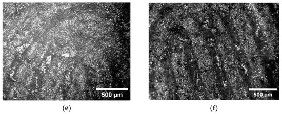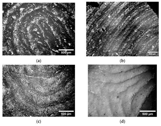 Microscopic observations of fingerprint casts made from two types of addition silicones with the addition of carbon nanotubes in various concentrations are shown in Figure 4. In AD Special silicone without nanotubes (Figure 4a), the outlines of the slats are visible, but the surface is characterized by numerous irregularities and local porosity, which may hinder the precise interpretation of second- and third-order details. The addition of 2% nanotubes (Figure 4b) clearly changes the surface morphology: a more heterogeneous structure appears with elongated artifacts running along the direction of the slats. At a higher concentration of 3% carbon nanotubes (Figure 4c), the surface becomes even rougher and the contours of the slats are less distinct, suggesting a deterioration in the quality of the image when the filler content is excessive.