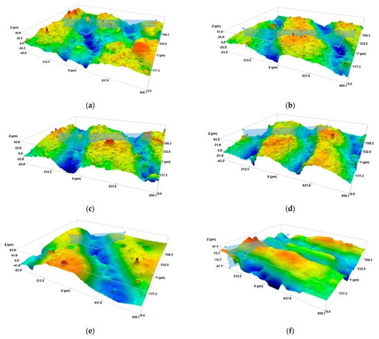 The surface morphology of the samples was analyzed using an optical confocal microscope (S neox, Sensofar S.L., Sensofar Metrology, Terrassa, Spain) equipped with a 20× EPI objective lens. The measurements were performed in confocal mode with a lateral resolution of 0.69 μm/pixel and a vertical scanning range of 89 μm. The scanned area was 850.08 × 709.32 μm, with an image size of 1232 × 1028 pixels. Acquisition was carried out using the SensoSCAN 6 software (version 1.8.0.0) with the Coarse Shift Single algorithm and a threshold of 5%. The total acquisition time for a single measurement was approximately 28 s. All measurements were performed in a non-contact mode under controlled laboratory conditions.