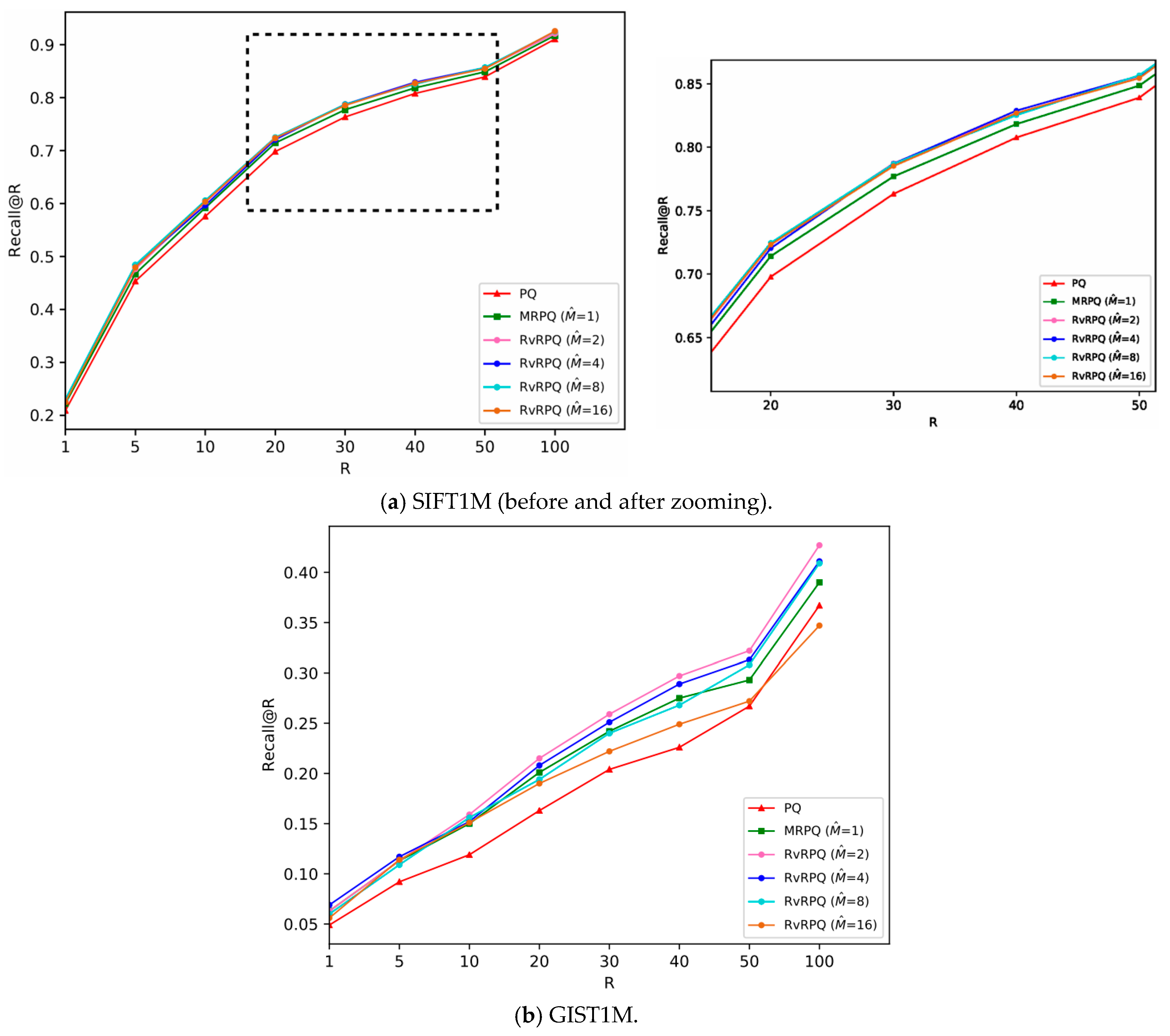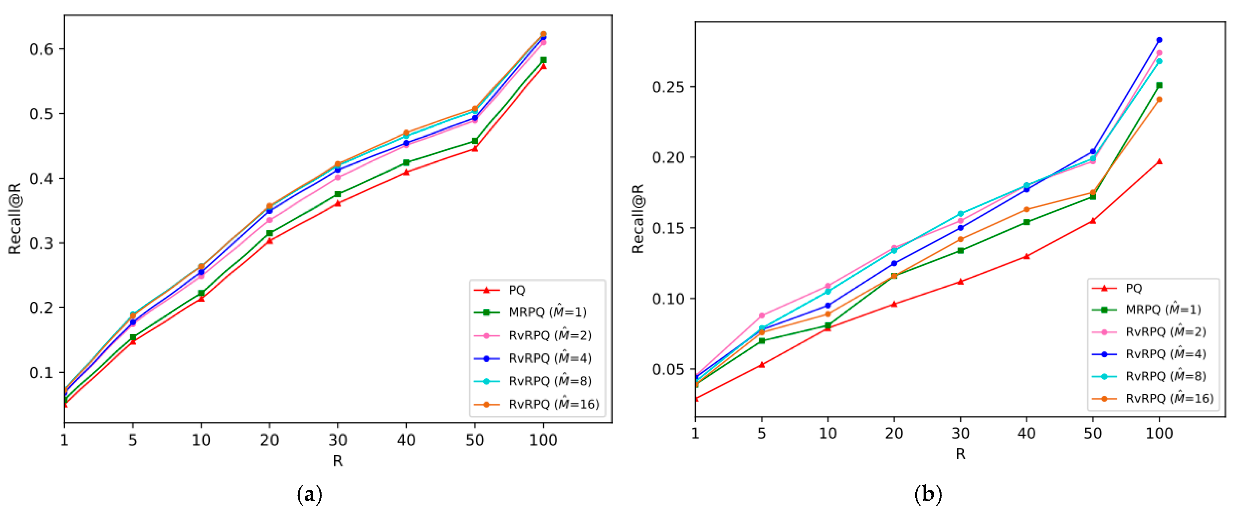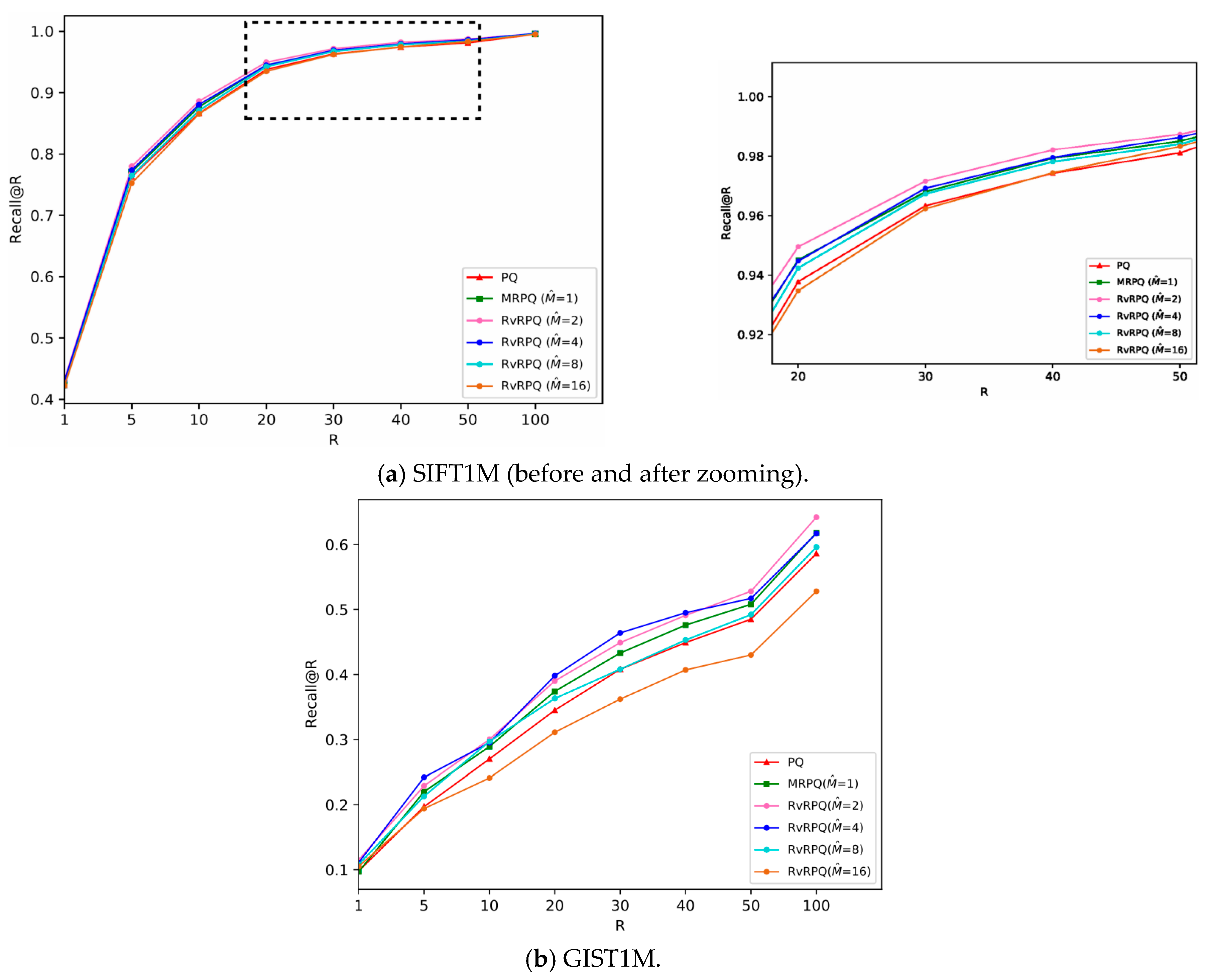 To verify the enhancement of the ANN search accuracy after removing the reference-vector, we assign the parameter of RvRPQ as respectively. When , the method RvRPQ degenerates to MRPQ.