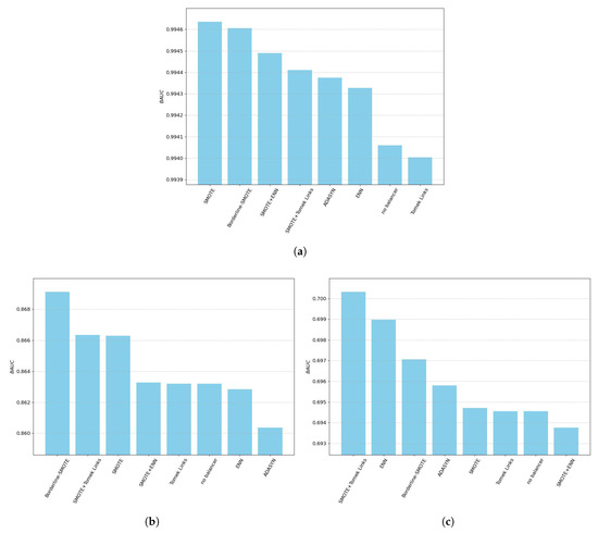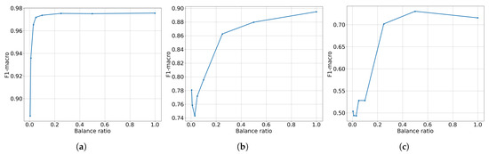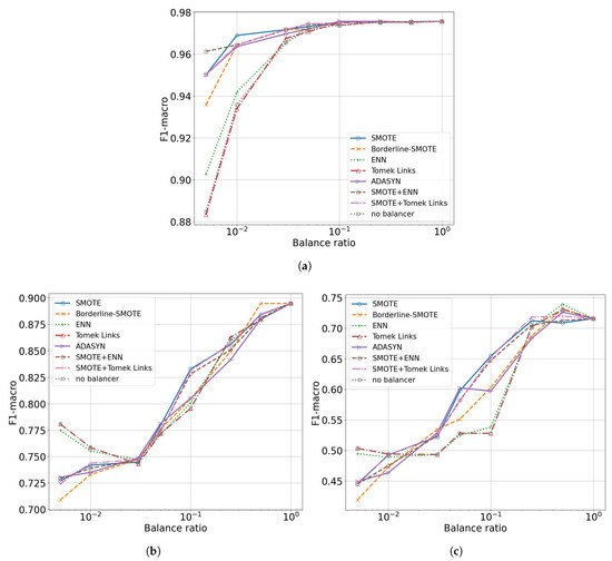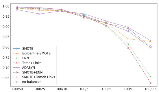 - For the lowest balance ratios (), the use of data balancing methods proved detrimental to the models, leading to a decrease in overall prediction performance, making them inapplicable in real-life systems.