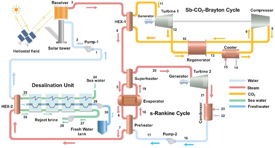 A review of the existing literature reveals that the integration of the Sb-CO2 with SPT systems offers remarkable potential for sustainable energy conversion. Owing to its environmentally friendly and long-term applicability, this approach not only stands out as a green alternative but also enables multigeneration opportunities while improving overall cycle efficiency. The schematic configuration of the proposed integrated system is presented in Figure 1. The proposed SPT-assisted Sb-CO2-based integrated energy system was modeled using the Ebsilon® Professional software 16. The system comprises the Sb-CO2, a bottoming sRC sub-cycle, and DS, with each component defined individually within the software environment. The thermodynamic properties of the working fluids were calculated through the built-in database of the program, and the overall system was simulated on a monthly basis over the course of an entire year for the Mediterranean region (MR). Energy balances were applied according to the boundary conditions at the nodal points, while pressure and heat losses, as well as component efficiencies, were taken into account to ensure a realistic evaluation of system performance. In addition, the MR has been identified as a suitable location for the implementation of the Sb-CO2, primarily due to its remarkable solar radiation potential. During the summer season, solar irradiation exceeds 27.46 MJ/m2 in July [35,36], providing the high-temperature and energy input required for efficient operation of the cycle. From a thermodynamic perspective, such an intense solar flux not only enhances the quality of the supplied energy but also improves both the energy efficiency and exergetic performance of the system, thereby strengthening its overall feasibility.