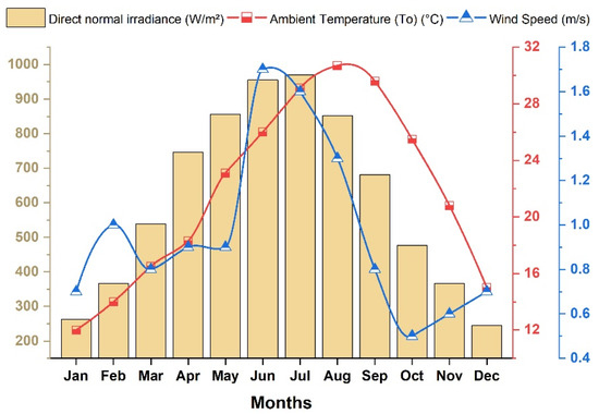 In this study, the reference location was selected as the eastern Mediterranean zone of Türkiye, which exhibits typical Mediterranean climatic characteristics. Meteorological data corresponding to the Hatay–Iskenderun region, known for its high solar irradiation potential, were obtained from the database of Ebsilon® Professional software and utilized as input parameters in the model. The monthly variation in direct normal irradiance, ambient temperature, and wind speed corresponding to the Hatay–Iskenderun region is illustrated in Figure 2.
