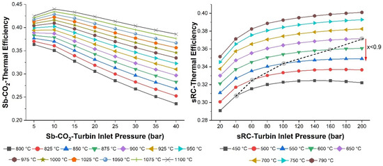 Comparison of the thermal efficiencies of the Sb-CO2 and the sRC as a function of turbine inlet pressure and turbine inlet temperature.