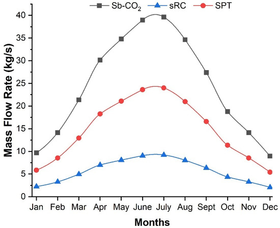 Monthly variation in mass flow rates for the Sb-CO2, sRC, and SPT.