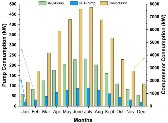 Monthly electricity consumption of the sRC pump, SPT-pump, and the compressor.