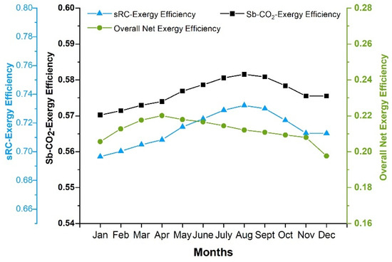 Monthly exergy efficiencies of the Sb-CO2, the sRC, and the overall system.