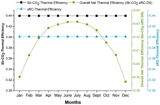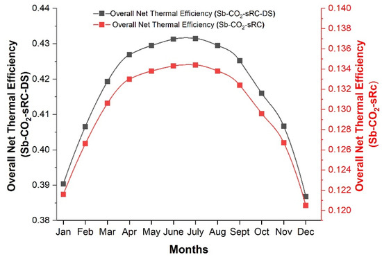 An examination of the monthly data reveals that the Sb-CO2 cycle consistently exhibits the highest exergy efficiency among the subsystems. Its minimum value occurs in January at 0.57, while the maximum is recorded in July and August at 0.58. The sRC reflects a similar yearly variation, reaching its minimum efficiency of 0.70 in January and a maximum of 0.73 in August. For the overall net exergy efficiency, the minimum value of 0.20 is observed during the winter months, whereas the maximum of 0.22 appears in April. All three exergy–efficiency time-series exhibit a marked increase in summer and a decrease in winter, highlighting the system’s sensitivity to solar irradiance. The monthly exergy efficiencies show that the sRC maintains the values (0.69–0.73) throughout the year, while the Sb-CO2 exhibits stable but efficiencies (0.57–0.58). The overall system efficiency remains in the range of 0.20–0.22. This is because the solar irradiation was directly taken as the solar input exergy, and thus, the relatively lower values reflect the selected reference basis rather than an actual performance limitation of the integrated system. These results confirm that the integrated system operates in a stable and consistent operation, as reflected by the consistent exergy efficiency profiles throughout the year. A previous study [65] reported that for the s-CO2 at a turbine inlet temperature of 900 °C, the thermal efficiency reached 56.67%, while the exergetic efficiency was 24.92%. In another investigation [66], the thermal efficiency of the s-CO2 was presented as approximately 40%, with an exergetic efficiency of about 61%. In another study [41] focusing on a simple CO2 Brayton cycle integrated with bottoming Rankine cycle, the exergetic efficiency of the Rankine subsystem was reported to be 52%. These findings indicate that the results obtained in the present work are consistent with those reported in the existing literature. The monthly overall net thermal efficiencies of the Sb-CO2-sRC-DS and Sb-CO2-sRC configurations as shown in Figure 9.