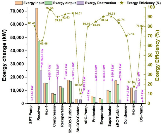 The overall and cycle-specific exergetic efficiencies, including those of the Sb-CO2 and sRC, are obtained using the governing equations given below. These relations are derived from the second law of thermodynamics and quantify the useful work potential relative to the exergy supplied. In other words, the exergetic efficiency can be interpreted as the ratio of the net useful work output to the total exergy input [47].