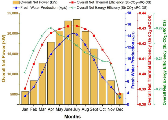 In order to determine the most suitable operating conditions of the system, the Sb-CO2 and the sRC were analyzed in detail under various turbine inlet temperatures and pressures to evaluate their thermal efficiency values. As a result of this analysis, the optimum operating points corresponding to the maximum thermal efficiency for both cycles were identified. These optimum operating points were subsequently adopted as the reference conditions for the remainder of the study, and based on them, the monthly performance variations in the cycles throughout the year were evaluated. In this way, annual analyses were carried out under these optimum conditions, thereby revealing the influence of seasonal variations and monthly climatic factors on thermodynamic efficiency. In Figure 3, it is observed that in the Sb-CO2 cycle, thermal efficiency reaches a maximum value when the turbine inlet pressure is 10 bar, and then gradually decreases along with the rising compressor work requirement. This effect is performed at especially high turbine inlet temperatures (after 900 °C). The maximum efficiency of the Sb-CO2 cycle is observed at 1100 °C and 10 bar (optimum), reaching approximately 44%. Then, at turbine inlet temperatures of 1000 °C, the Sb-CO2 reaches thermal efficiencies exceeding 40%. The main reason for this is the variation in mass flow rate under constant heat input and the influence of the regenerator. Therefore, although the gross power increases with rising temperature at each pressure level, the net power at a turbine inlet pressure of 10 bar is found to be higher than at other pressures within the turbine inlet temperature range of 925 °C to 1100 °C. Therefore, it is observed that the thermal efficiency of the Sb-CO2 cycle is higher at a turbine inlet pressure of 10 bar when the temperature exceeds 925 °C. However, between 800 and 900 °C, an increase in turbine inlet pressure raises the back work ratio and reduces the influence of the regenerator. Therefore, a continuous decline in thermal efficiency is observed with increasing pressure. On the other hand, the sRC exhibits a continuous increase in thermal efficiency with rising turbine inlet pressure at all temperature levels (except for 450 °C). At constant turbine inlet pressure, the thermal efficiency of the sRC also increases steadily as the temperature rises. It is evident that the rate of increase in thermal efficiency is higher between 20 and 80 bar, while it decreases after 80 bar. The sRC achieves its maximum thermal efficiency at 200 bar and 790 °C, whereas the minimum thermal efficiency is observed at 20 bar and 450 °C. The minimum and maximum thermal efficiencies of the sRC are calculated as 0.29 and 0.40, respectively. In addition, the black dashed line in Figure 3 indicates the region where the steam quality falls below x < 0.9, representing unfavorable turbine conditions. Therefore, it should be forgotten that the sRC must not operate at a dryness fraction lower than 0.9. Based on these results, the analysis of the SPT–Sb-CO2–sRC–DS multigeneration system will be carried out under the optimal thermal efficiency conditions, namely 10 bar and 1100 °C for the Sb-CO2, and 200 bar and 790 °C for the sRC. Figure 4 presents the monthly mass flow variations in the Sb-CO2, sRC, and SPT in a comparative manner, clearly illustrating the influence of seasonal conditions on overall system performance. In a similar study [42], it was reported that for a s-CO2 Brayton cycle integrated with a solar power tower, an increase in turbine inlet temperature enhances the cycle efficiency, whereas operating the system at pressures beyond a certain threshold leads to higher exergy destruction, thereby reducing the overall performance. The study further indicated that the efficiency of the s-CO2 lies within the range of 44–48% (923.15 K and 19,980 kPa optimum for turbine inlet), while the bottoming sRC achieves values between 43% and 44.5% (388.66 K and 12,000 kPa optimum for turbine inlet). In another investigation [20], the thermal efficiency of the s-CO2 was determined to be 35.53% (550 °C and 25 MPa optimum for turbine inlet), and this result was found to be consistent with the efficiency values reported in previous studies. Finally, the optimum operating conditions of the system were determined from thermal efficiency analyses and subsequently adopted for all further evaluations. Based on these results, the analysis of the SPT–Sb-CO2–sRC–DS multigeneration system will be carried out under the optimal thermal efficiency conditions, namely 10 bar and 1100 °C for the Sb-CO2, and 200 bar and 790 °C for the sRC. The monthly mass flow variations in the Sb-CO2, the sRC, and the SPT are presented in a comparative manner over the entire year, clearly demonstrating the influence of seasonal conditions on overall system performance, as shown in Figure 4.
