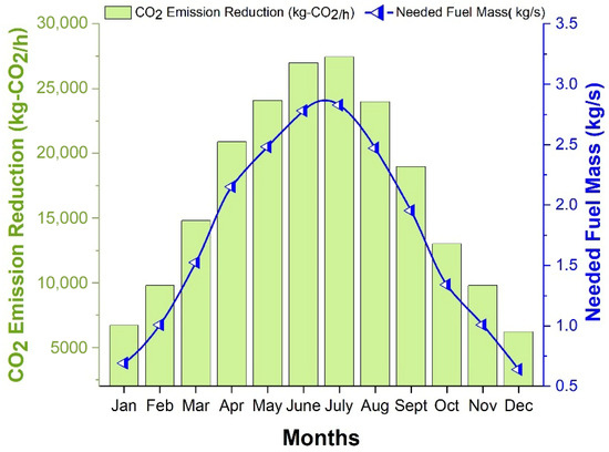 Here, represents the total heat input required by the GT to generate the same amount of power as that produced by the subsystems. The terms and denote the net power output of the subsystems together with the thermal efficiency of the GT. In addition, and represent, respectively, the net heat input to the desalination system and the efficiency of the . Then, the overall mass of fuel required to supply the necessary total heat is determined using the following relation: