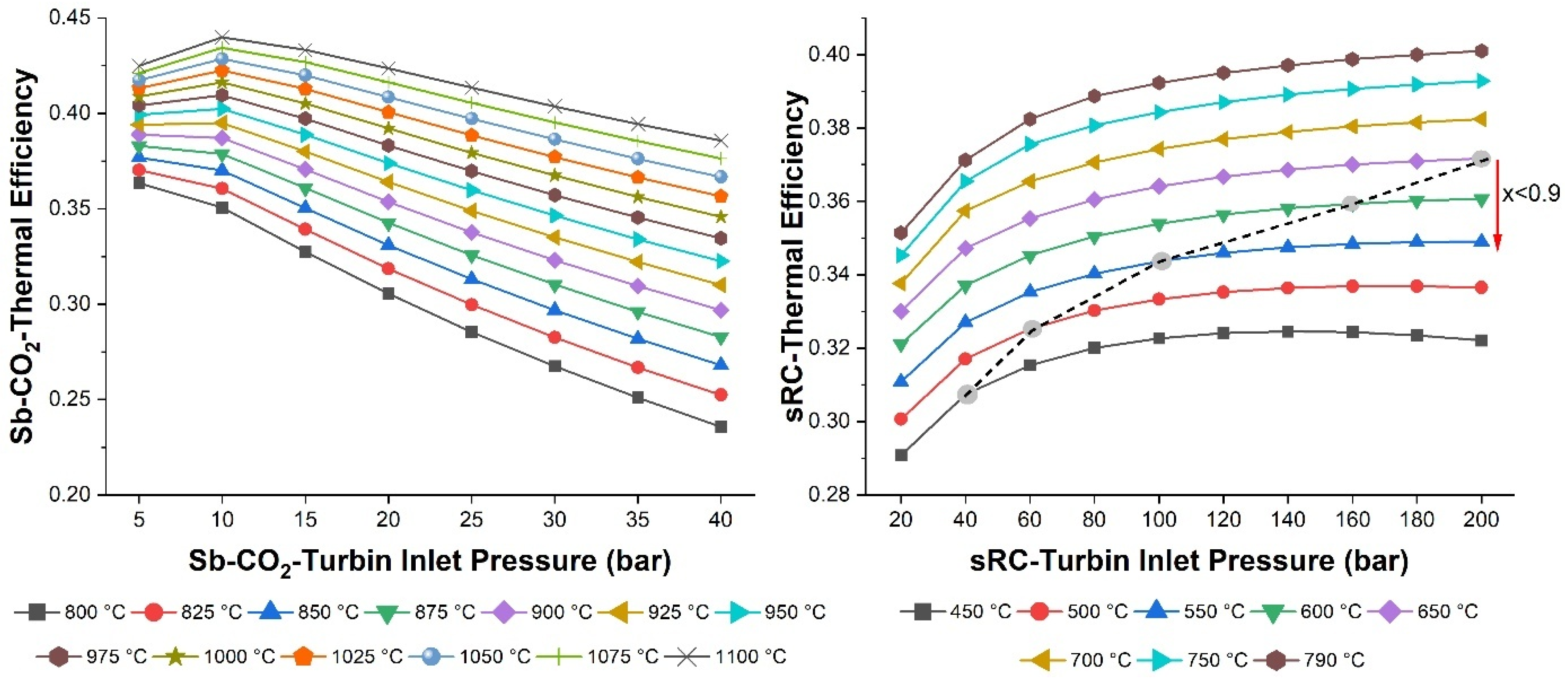 - In the Sb-CO2, thermal efficiency improves with higher turbine inlet temperature but is highly sensitive to pressure (10 bar and 1100 °C optimum); beyond 10 bar, further pressurization causes efficiency losses due to increased compressor work. By contrast, in the sRC, efficiency increases steadily with rising pressure (200 bar and 790 °C optimum).