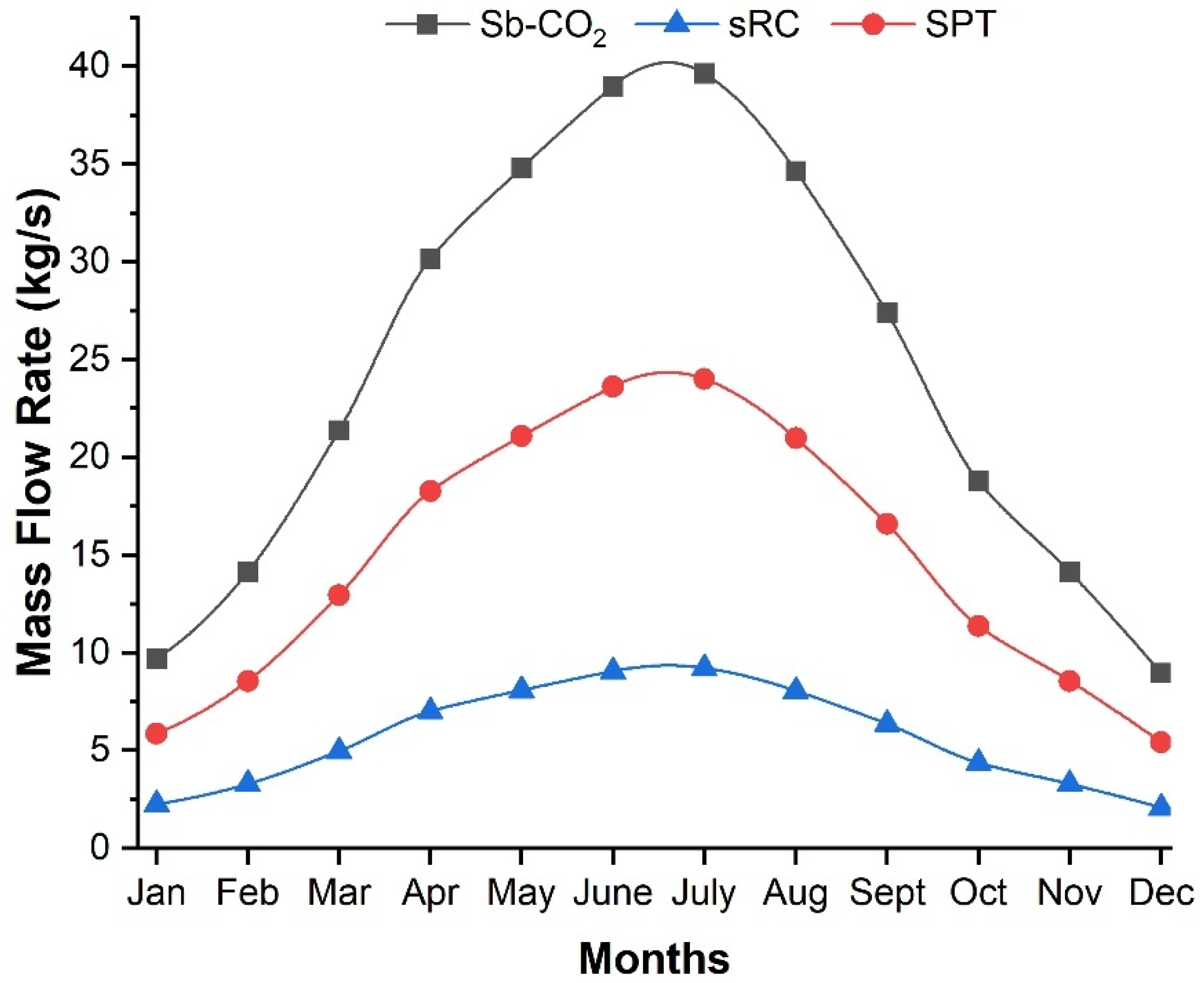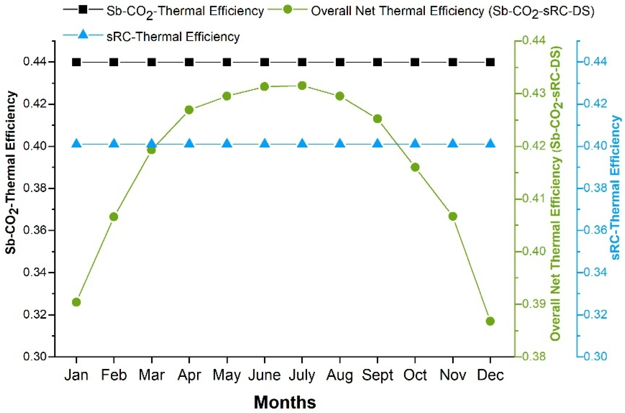 - The integrated system delivered electricity and freshwater concurrently throughout the year. Total net power increased from 5.74 MW in January to 23.48 MW in July, while the freshwater production rate rose from 3.48 kg/s to 14.25 kg/s. The monthly net thermal efficiency of the integrated configuration (Sb-CO2-sRC-DS) ranged from 0.39 to 0.43. At the subcycle level, the Sb-CO2 and sRC maintained thermal efficiencies of approximately 0.12 and 0.13, respectively.