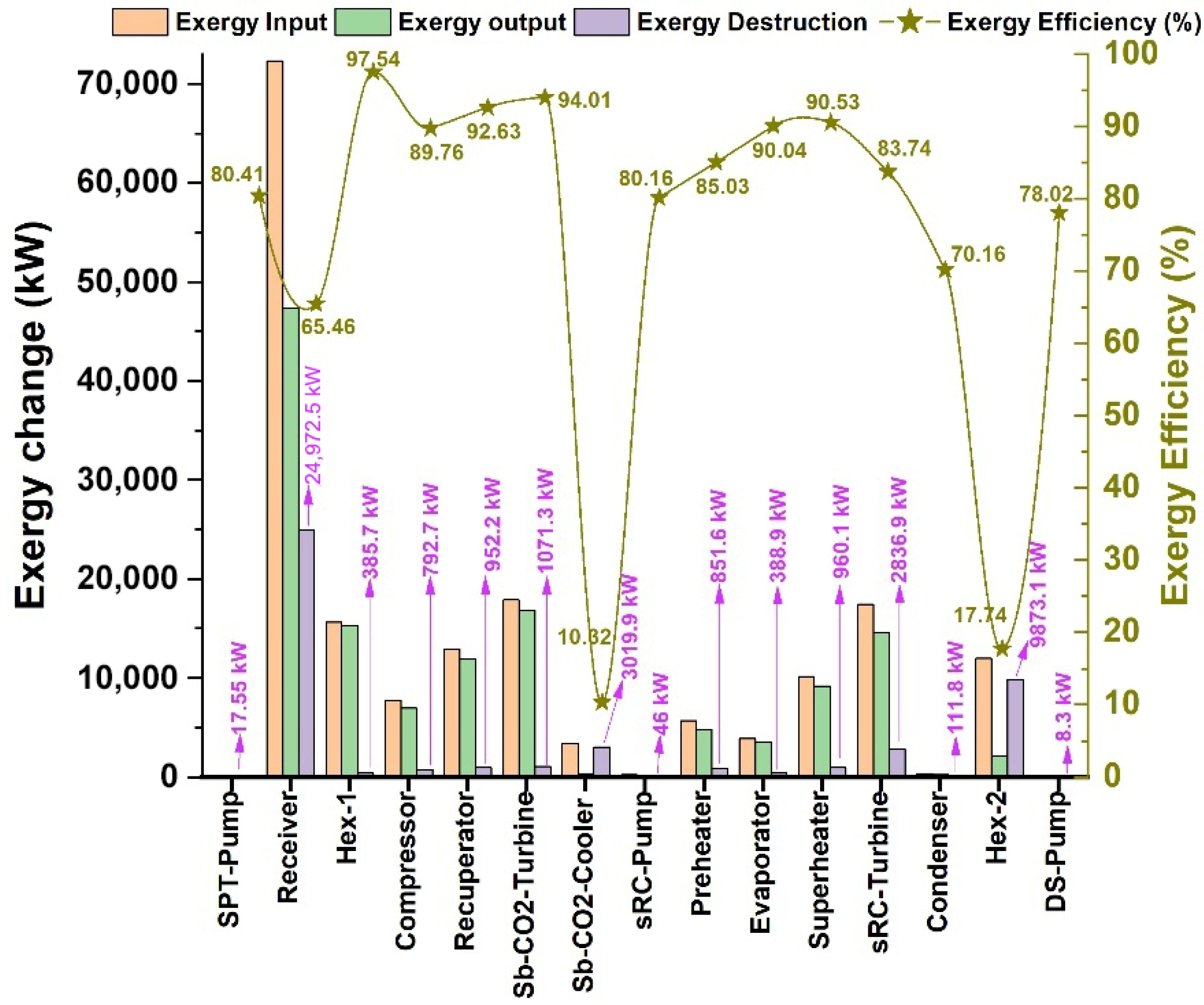 - A component-based analysis indicates that the largest irreversibilities occur in the solar receiver (24.97 MW exergy destruction; = 65.46%) and the Sb-CO2 cooler (3.02 MW; = 10.3%). In contrast, the Rankine-side heat exchangers and the turbine achieve higher exergetic efficiencies (83.74–90.53%), reflecting comparatively lower exergy destruction. Consequently, the receiver, HEX-2, and the Sb-CO2 cooler are identified as the primary targets for performance improvement.