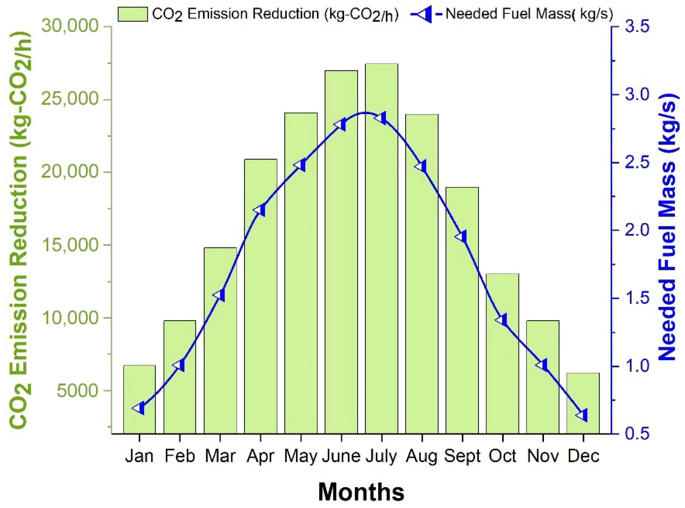 - The analysis confirms that higher solar availability directly enhances the system’s capacity for CO2 mitigation, enabling a seasonal reduction of up to 27,434.55 kg-CO2/h, which underscores the significant environmental benefit of the proposed configuration.