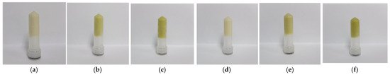 Photographs of oleogels based on starch and extracts of cassava. Samples (a) OG_S0.5_E0.00, (b) OG_S0.5_E0.25, (c) OG_S0.5_E0.50, (d) OG_S1.0_E0.00, (e) OG_S1.0_E0.25 and (f) OG_S1.0_E0.50.