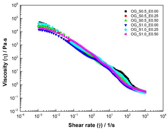 The rheological properties of oleogels were evaluated by evaluating their behavior in a stationary and oscillatory state. Figure 2 shows a decrease in viscosity with the shear rate, typical of shear thinning behavior.