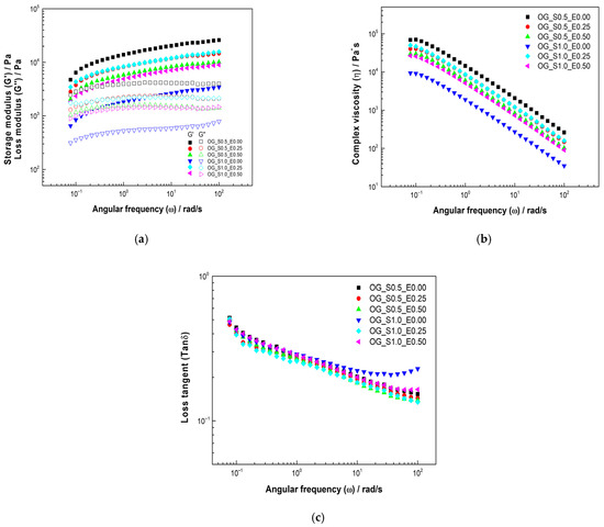 Viscoelastic properties of oleogels based on starch and extracts of cassava: (a) storage and loss modulus, (b) complex viscosity, and (c) loss tangent.