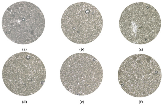 Micrograph of oleogels based on starch and extracts of cassava: (a) OG_S0.5_E0.00, (b) OG_S0.5_E0.25, (c) OG_S0.5_E0.50, (d) OG_S1.0_E0.00, (e) OG_S1.0_E0.25, and (f) OG_S1.0_E0.50.