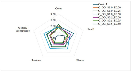 Regarding the flavor attribute, C_OG_S1.0_E0.50 presented a favorable score of 7.83, similar to that obtained by C_OG_S1.0_E0.25, with a score of 7.33, which contained 0.25% extract. It should be noted that the formulations containing extracts generated interest among the panelists, due to their softer texture and higher moisture content. Similarly, regarding texture, the C_OG_S1.0_E0.50 formulation stood out (7.70) compared to the other cookie formulations, which presented lower scores.