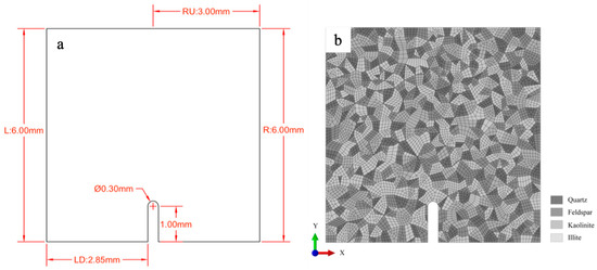 Firstly, the model was divided into 722 Voronoi cells using the Voronoi tessellation technique. Each Voronoi cell represented a mineral grain, with the grain size referenced from the research work of Ji et al. [45]. Then, the four minerals (quartz, feldspar, kaolinite, and illite) were randomly assigned to the Voronoi cells in a descending order of grayscale, with compositions of 30%, 30%, 20%, and 20%, respectively, forming geometric sets for each mineral. Finally, the model was meshed with a grid size of 0.08 mm. Cohesive elements with zero thickness were embedded along the grain boundaries and globally within the mesh to establish a heterogeneous mineral model of shale, as shown in Figure 2b. Each mineral set contained four-node plane strain solid elements (CPE4), as well as cohesive elements with zero thickness at the boundaries of the CPE4 elements. Cohesive elements were also established at the boundaries between different minerals to form mineral boundary sets. The model simulated crack initiation and progression through the degradation and failure of cohesive elements under mechanical loading. The parameters for the mineral CPE4 elements are shown in Table 1, which was based on the data of Wang et al. [46]. The parameters for the internal cohesive elements within each mineral and the cohesive elements at different mineral boundaries are shown in Table 2, which was based on the data of Zhang, Cui, Han, Si and Zhao [44]. It should be noted that the mechanical properties of mineral boundaries depend on the bonding strength, and there is currently no unified method for characterizing the solid clay strength. Many experimental studies have suggested that mineral boundaries exhibit higher packing density and stronger bonding compared to clay minerals [47,48,49,50]. Therefore, in this model, the strength parameters of the mineral boundaries were set slightly larger than that of kaolinite but smaller than that of feldspar.