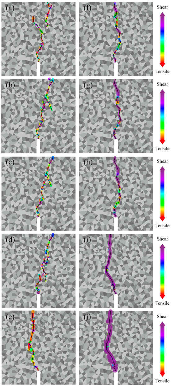 Investigating which minerals the cracks traverse and how they traverse these minerals under different confining pressures can provide valuable insights into the mechanical responses of minerals under varying confining pressures. In tensile loading, increasing confining pressure has a minor influence on the proportion of crack length in each mineral compared to the total crack length. However, the proportion of tensile fractures in each mineral decreases with increasing confining pressure. In shear loading, higher confining pressures induce more shear failures in minerals with higher mechanical strength, resulting in a decrease in the proportion of tensile fractures in each mineral with increasing confining pressure. In tensile loading, as the confining pressure increases, some minerals that were originally under tensile stress transition to shear stress. However, the shear strength of minerals is significantly higher than their tensile strength, rendering these minerals unable to undergo fracture. Consequently, higher confining pressures lead to a reduced distribution range of discontinuous cracks, resulting in a lower degree of crack complexity. In shear loading, higher confining pressures cause an increase in shear stress near the shear centerline, making it easier to shear the high-strength minerals at the shear centerline. This results in almost exclusively shear fractures, leading to straighter cracks. These findings are consistent with previous studies where an increasing confining pressure leads to a gradual transition from tensile fractures to predominantly shear fractures in rock. In addition to grain boundary cracks, transgranular cracks also significantly increase in the shear fracture zone [55,63].