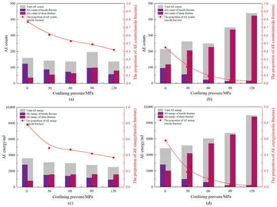Based on the simulation results and AE localization results, the final crack paths and fracture types are superimposed, as shown in Figure 4. In this figure, different colors of AE represent different fracture types, while the size of AE circles indicates the magnitude of fracture energy. It can be observed from the figure that with increasing confining pressure, significant differences exist in terms of the extension paths, fracture types, and fracture energy of tensile and shear-loaded microcracks. Therefore, the computation of crack length and fractal dimension is presented in Figure 5, while the statistical analysis of AE fracture types and fracture energy is illustrated in Figure 6. In this study, the box dimension method was used to calculate the fractal dimension (D) of cracks under six different loading methods. The fractal dimension quantifies structural irregularity, offering a robust framework for analyzing crack morphology and topological complexity in fractured surfaces. Larger fractal dimensions correlate with increased crack complexity, which subsequently enhances shale gas recovery efficiency.