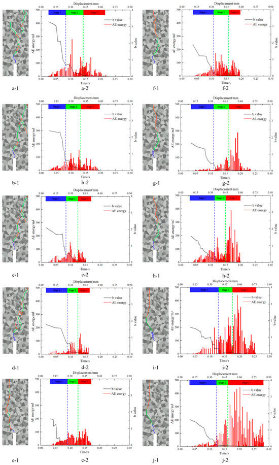 By comparing and analyzing the crack propagation process, fracture locations, and AE characteristics, it can be observed that in tensile loading, cracks initially form in minerals with lower strength, followed by fractures occurring in minerals with higher strength, ultimately resulting in the connectivity of discontinuous cracks. On the other hand, in shear loading, cracks first penetrate through minerals with lower strength and then propagate through minerals with higher strength along the direction of the shear stress centerline. Regardless of whether it is tensile or shear loading, the crack propagation process exhibits certain stages. Therefore, in this study, the fracture stages are divided based on the AE b value. The b value is a parameter used in seismology and rock mechanics to characterize the magnitude-frequency distribution of AE events [52]. In 1944, Gutenberg and Richter first proposed that b value reflects the relationship between the frequency and magnitude of earthquakes [53]. In the initial stage, cracks penetrate through minerals with low strength, resulting in smaller fracture energies and a predominance of small-scale fractures, leading to larger AE b values. Subsequently, the AE b value gradually decreases, indicating an increase in the proportion of high-energy fracture events, as the cracks traverse minerals with higher strength.
