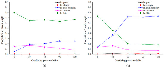 The proportion of crack length passing through various minerals under different confining pressure conditions is shown for tensile loading (a) and shear loading (b).
